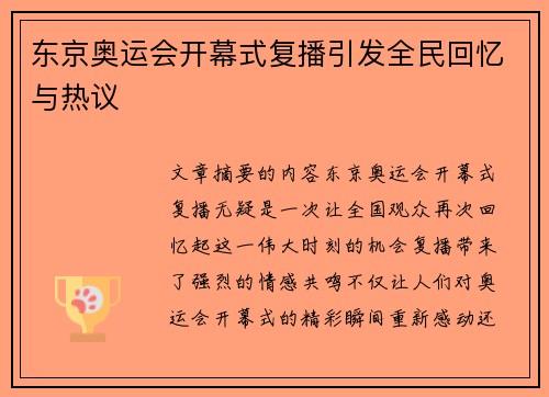 文章摘要的内容东京奥运会开幕式复播无疑是一次让全国观众再次回忆起这一伟大时刻的机会。复播带来了强烈的情感共鸣,不仅让人们对奥运会开幕式的精彩瞬间重新感动,还激发了全民对奥运精神的深刻反思。本文将从复播...